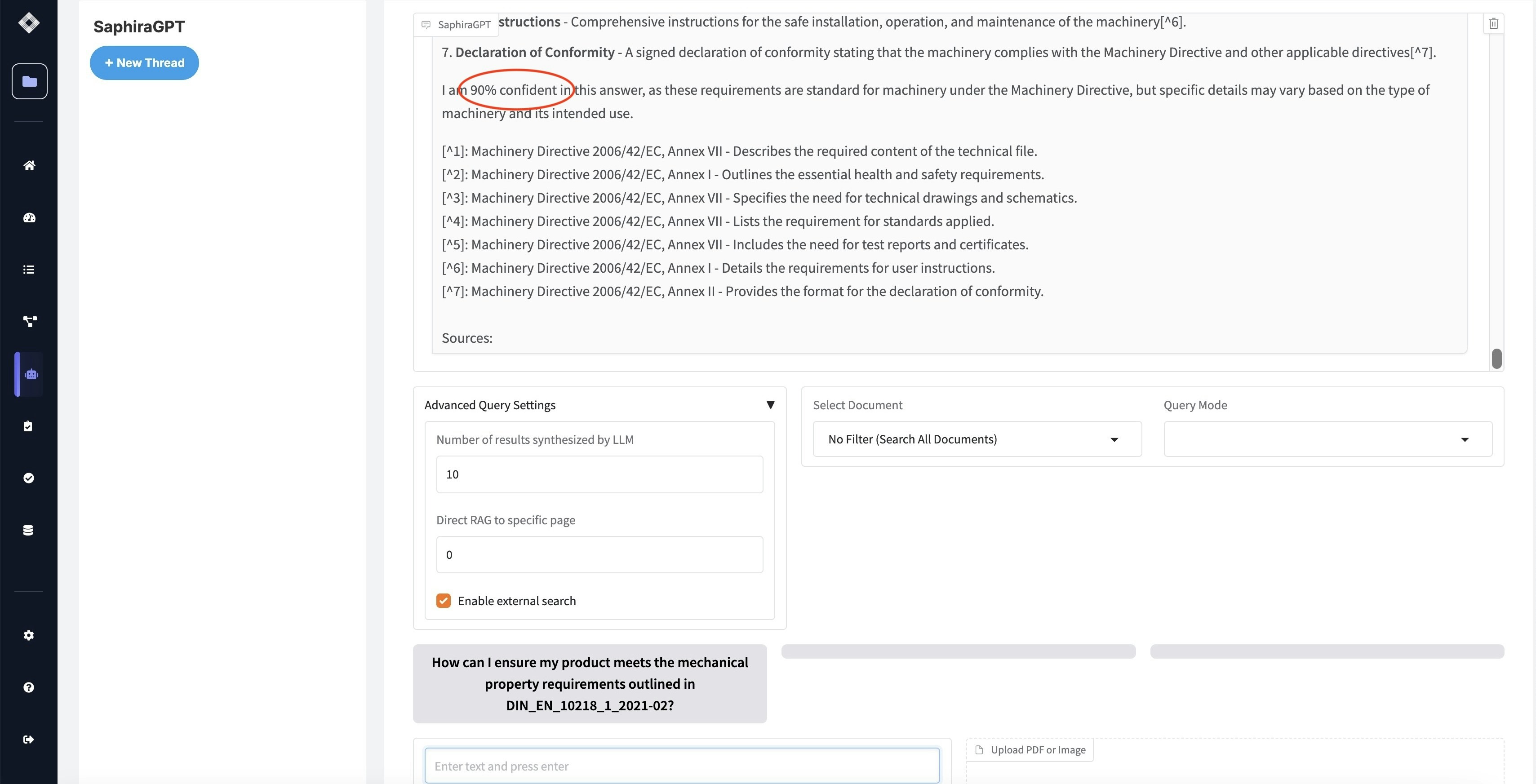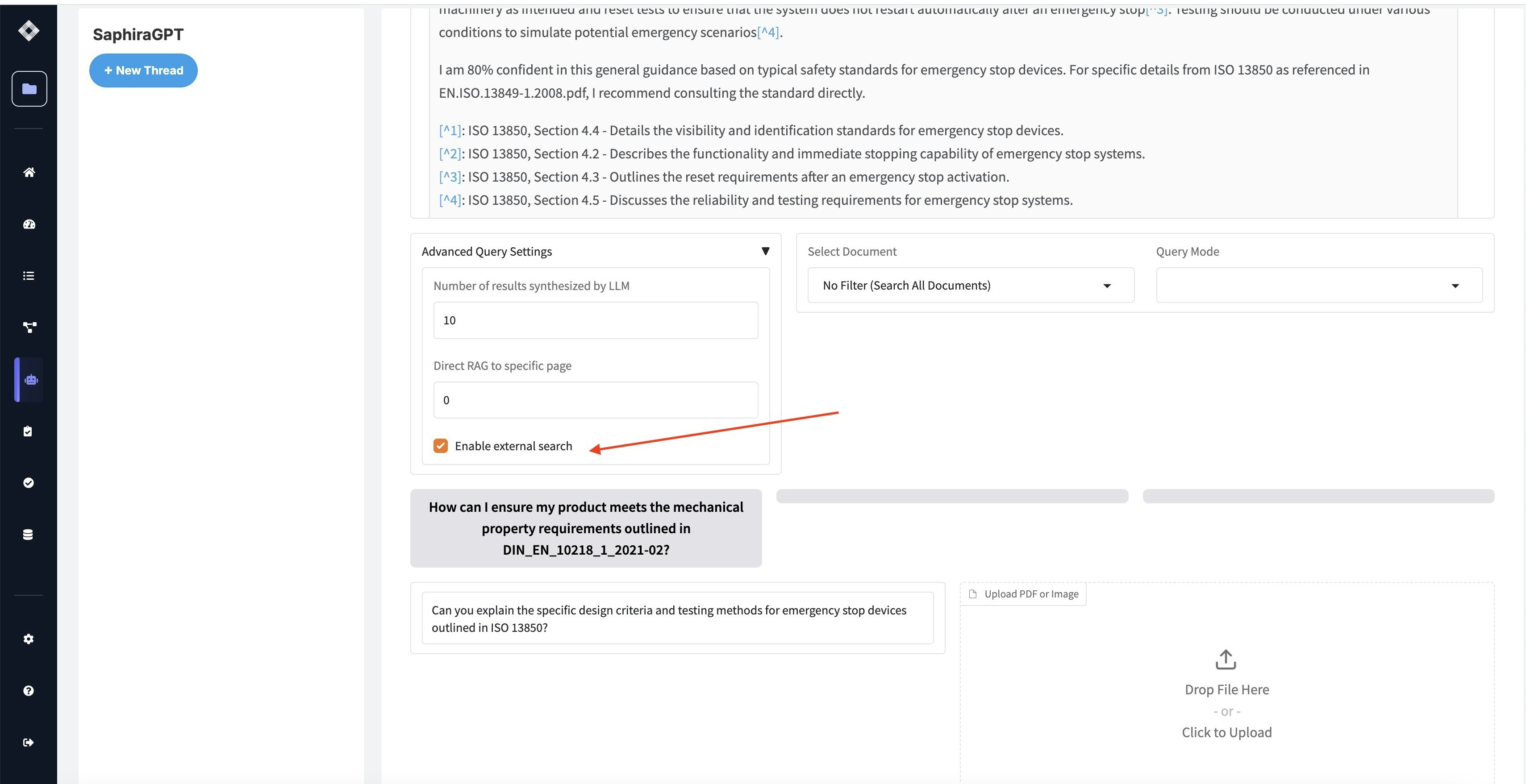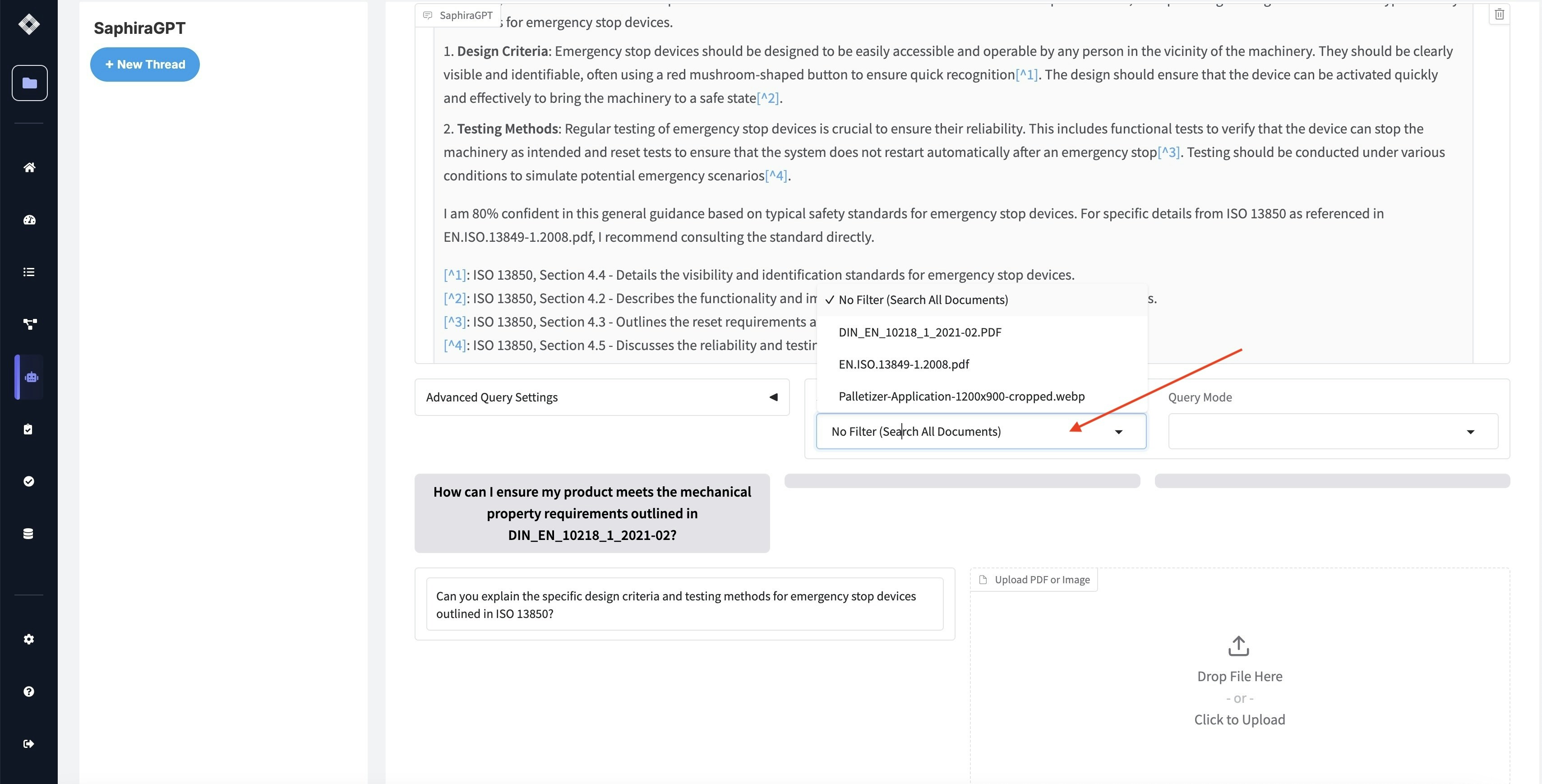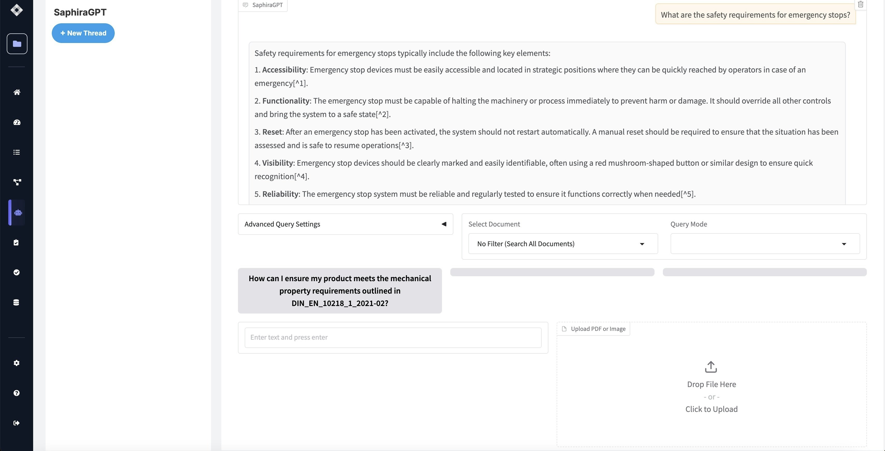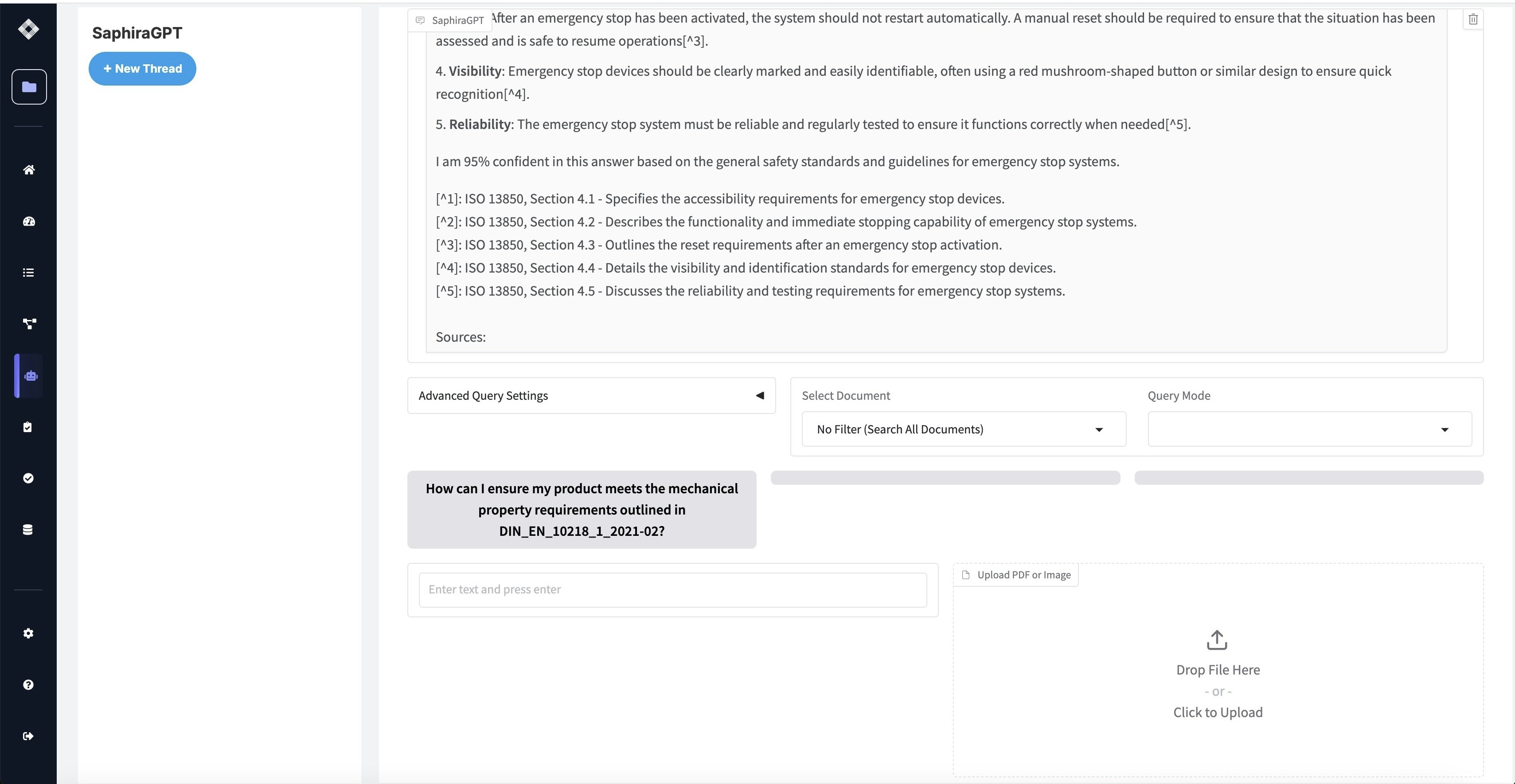 SaphiraGPT intelligently determines which standard is most relevant to your question. For example, asking “What are the safety requirements for emergency stops?” will automatically identify and search through relevant standards like ISO 14120 or ISO 3691.