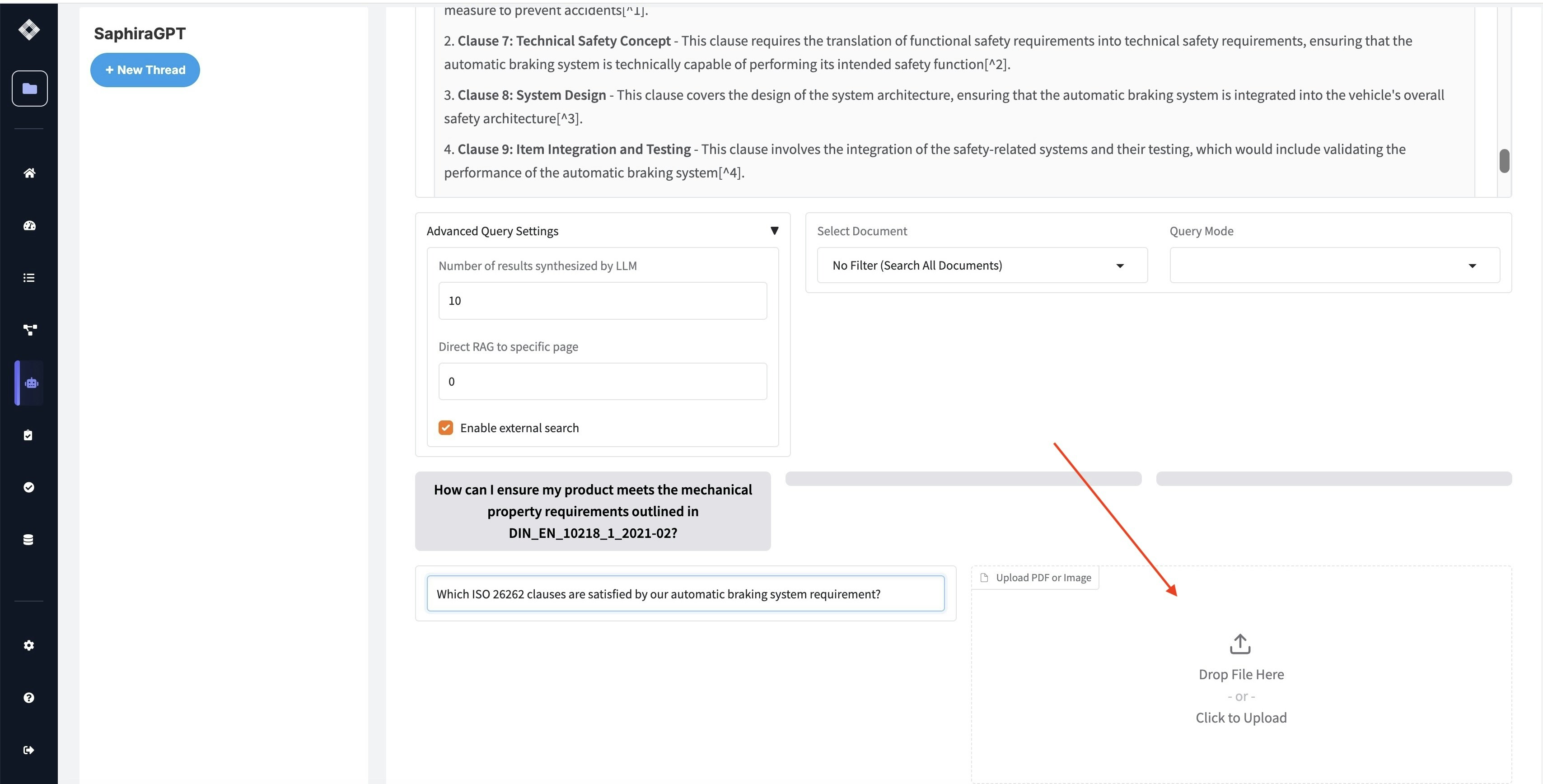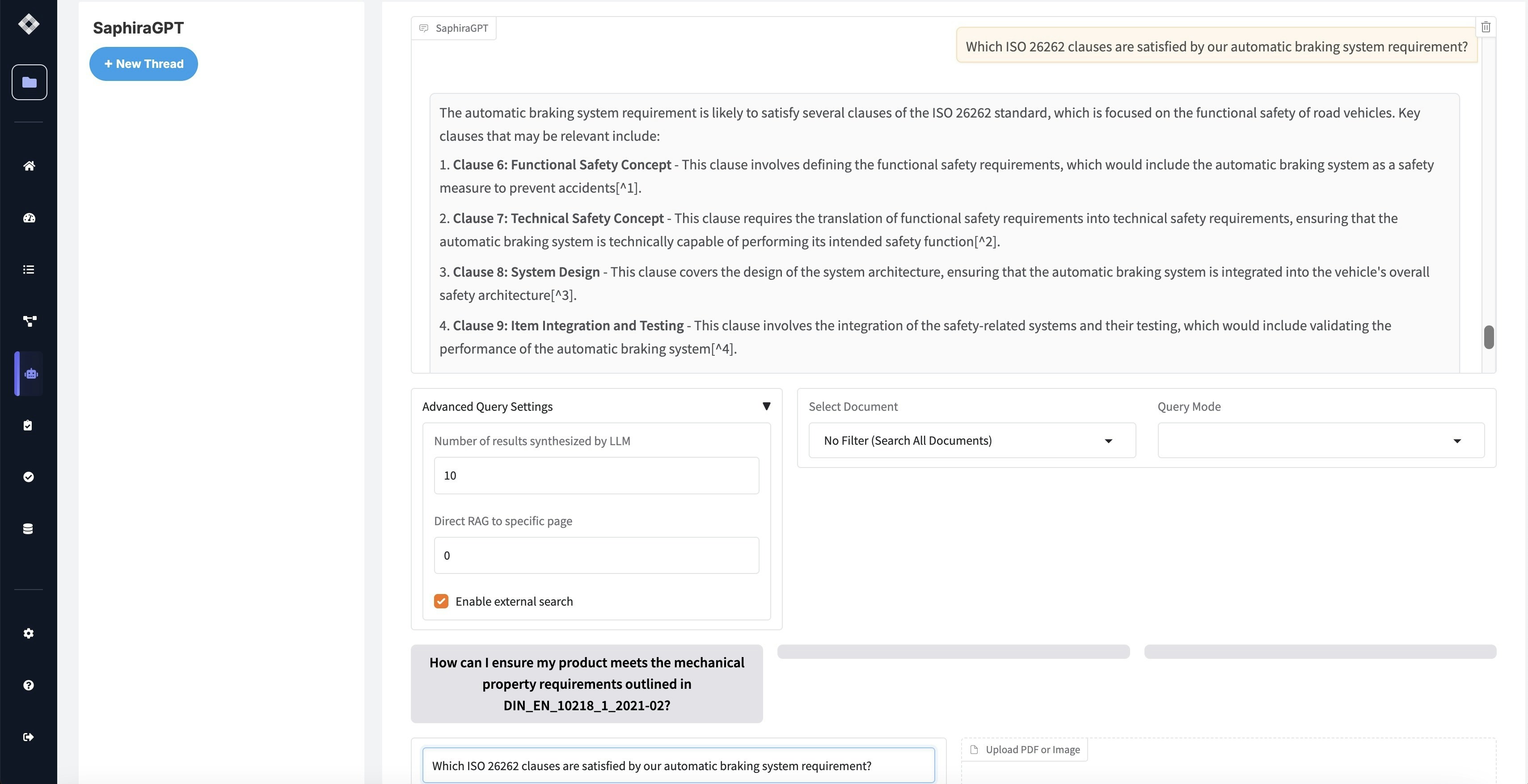 Ask questions about how your project requirements trace to specific standards clauses. SaphiraGPT can identify connections between your design decisions and regulatory requirements.